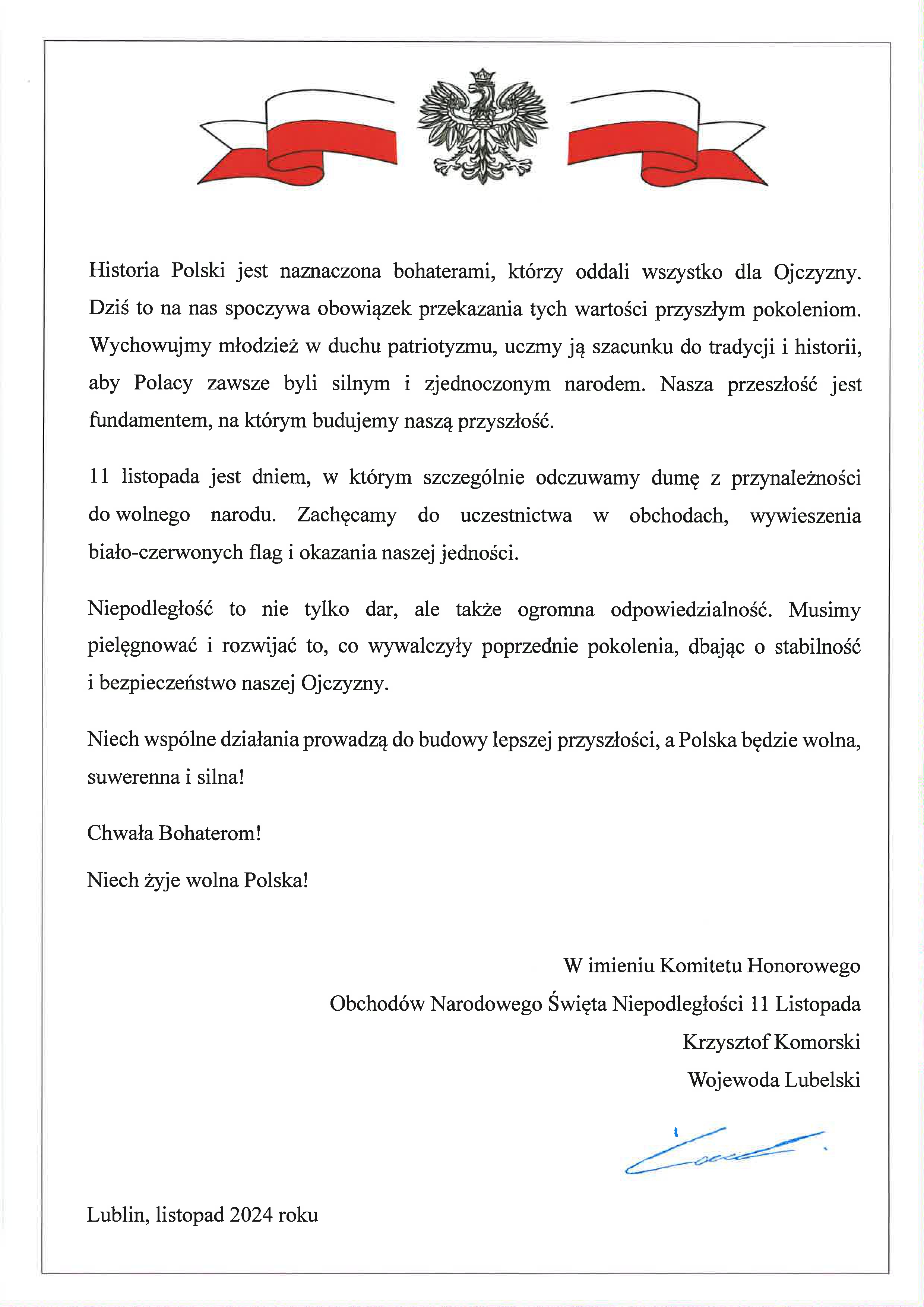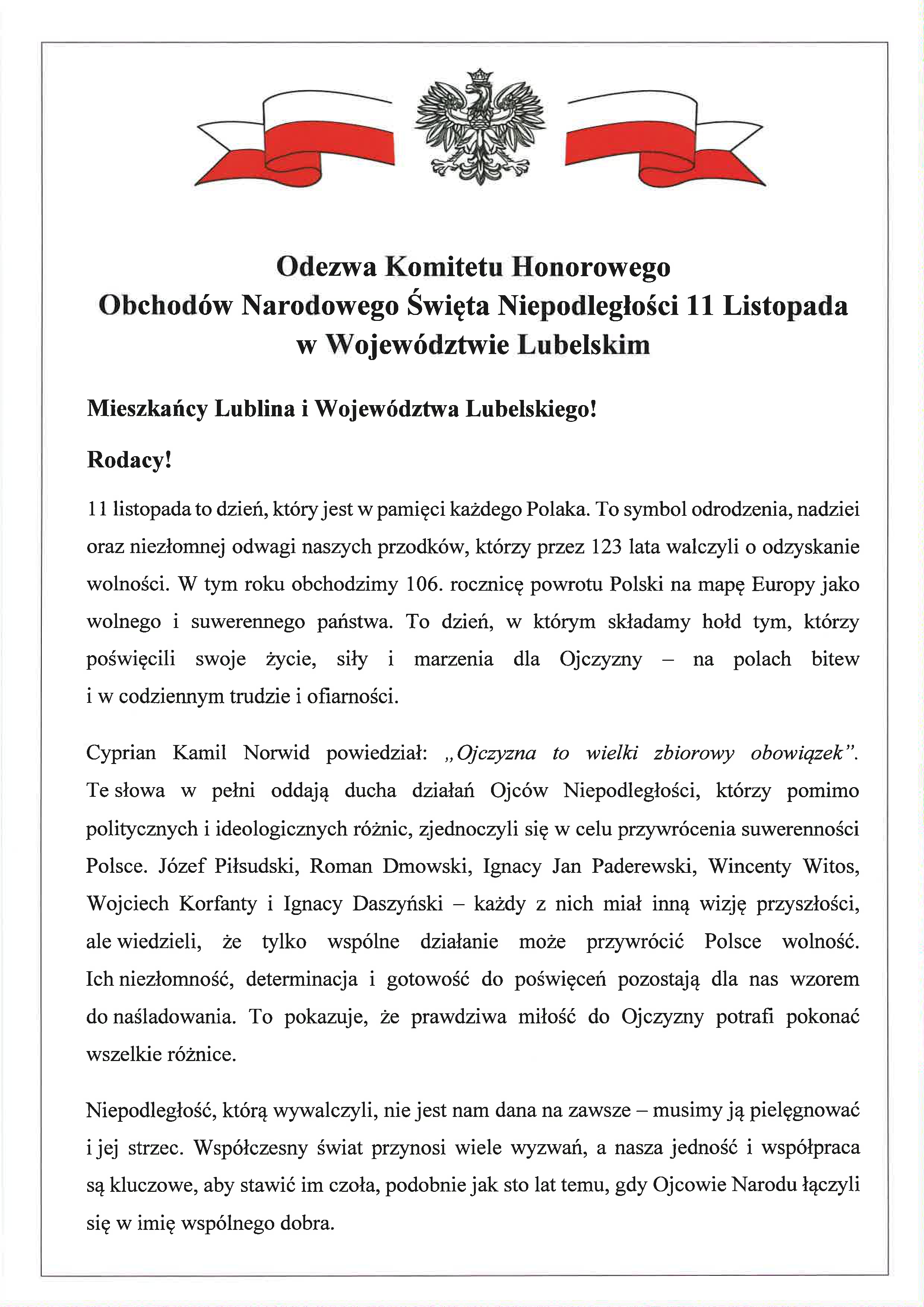 Odezwa Komitetu Honorowego Obchodów Narodowego Święta Niepodległości 11 Listopada w Województwie Lubelskim